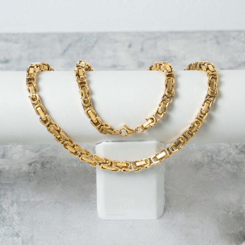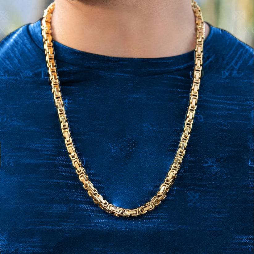 - Cadena: Estilo rústico de 6mm de grosor y 65cm de largo, con acabado texturizado en oro laminado 18K para un look masculino y auténtico.